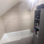 Bathroom suite fitted with low level WC, low level hand wash basin and bath with glass shower screen and mixer tap. Heated towel rack.