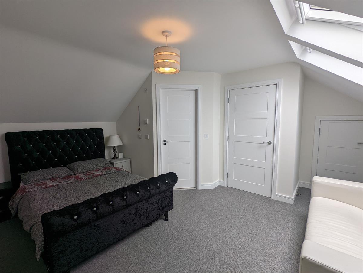 Large bedroom with double Velux windows, wall mounted radiator, power points, built in eaves storage with hanging space with shelves.