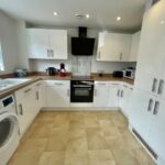 Rear aspect double glazed window, range of eye and base level units with work surfaces over, under floor heating, integrated fridge/freezer, newly fitted induction hob with extractor fan over and integrated oven underneath, space for white goods, 1 1/2 ceramic sink bowl with mixer taps, power points, cupboard housing under floor heating system.