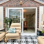 This impressive hexagonal conservatory offers a sophisticated retreat with a private outlook over the beautifully landscaped rear garden and patio. Built with a solid one-third brick base, the space features premium self-cleaning blue glass windows and a matching glazed ceiling, complete with an integrated fan for year-round climate control. The striking black-and-white tiled flooring adds a touch of classic elegance to the modern design, while twin vertical wall-mounted radiators ensure the room remains a comfortable family space regardless of the season. French doors provide a seamless transition to the outdoor patio area, and all windows are finished with fitted vertical drapes for added privacy and light control.