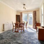 A spacious dual-aspect living room with front aspect double-glazed window and rear French doors opening onto the garden. The room features ceiling coving, ceiling lighting, two wall-mounted radiators, and access to under-stair storage and the kitchen.