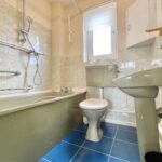 Front aspect with obscured double-glazed window, fitted with a wall-to-wall bathtub with stainless steel mixer tap and handheld showerhead, low-level WC, hand wash basin with stainless steel taps, wall-mounted radiator, and ceiling lighting.