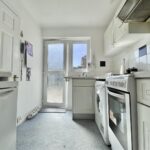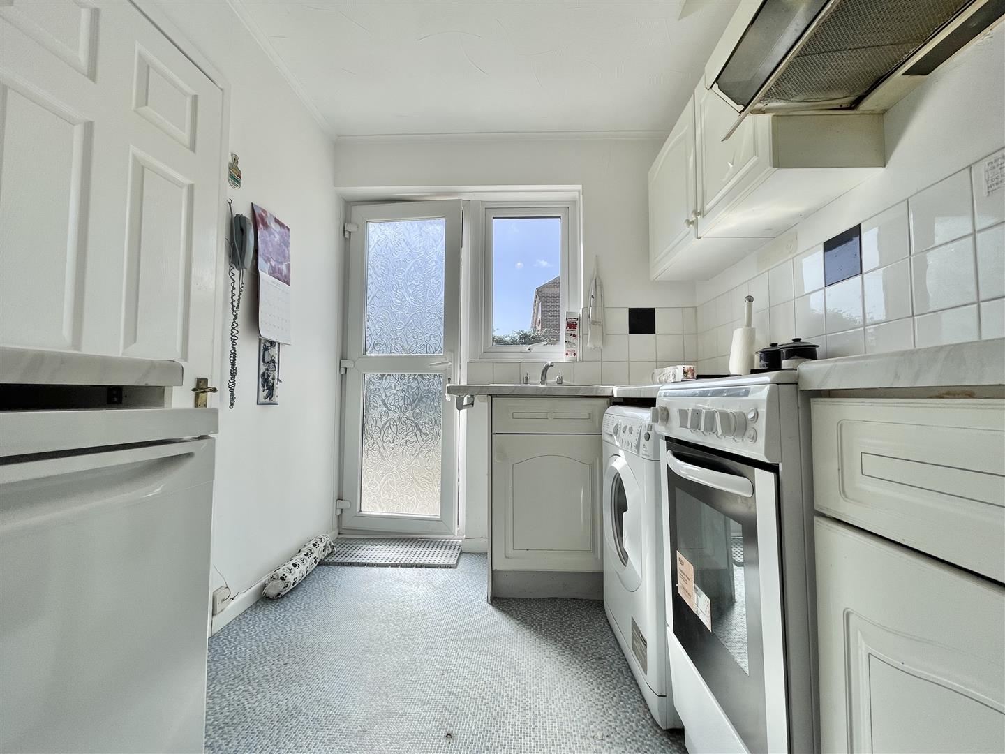 A bright rear aspect kitchen with a double-glazed window overlooking the garden. Fitted with a range of wall and base units, stainless steel sink with mixer tap, space for white goods, and oven with extractor above. The room is partially tiled, with ceiling lighting, coving, and an obscured double-glazed door giving access to the rear garden.