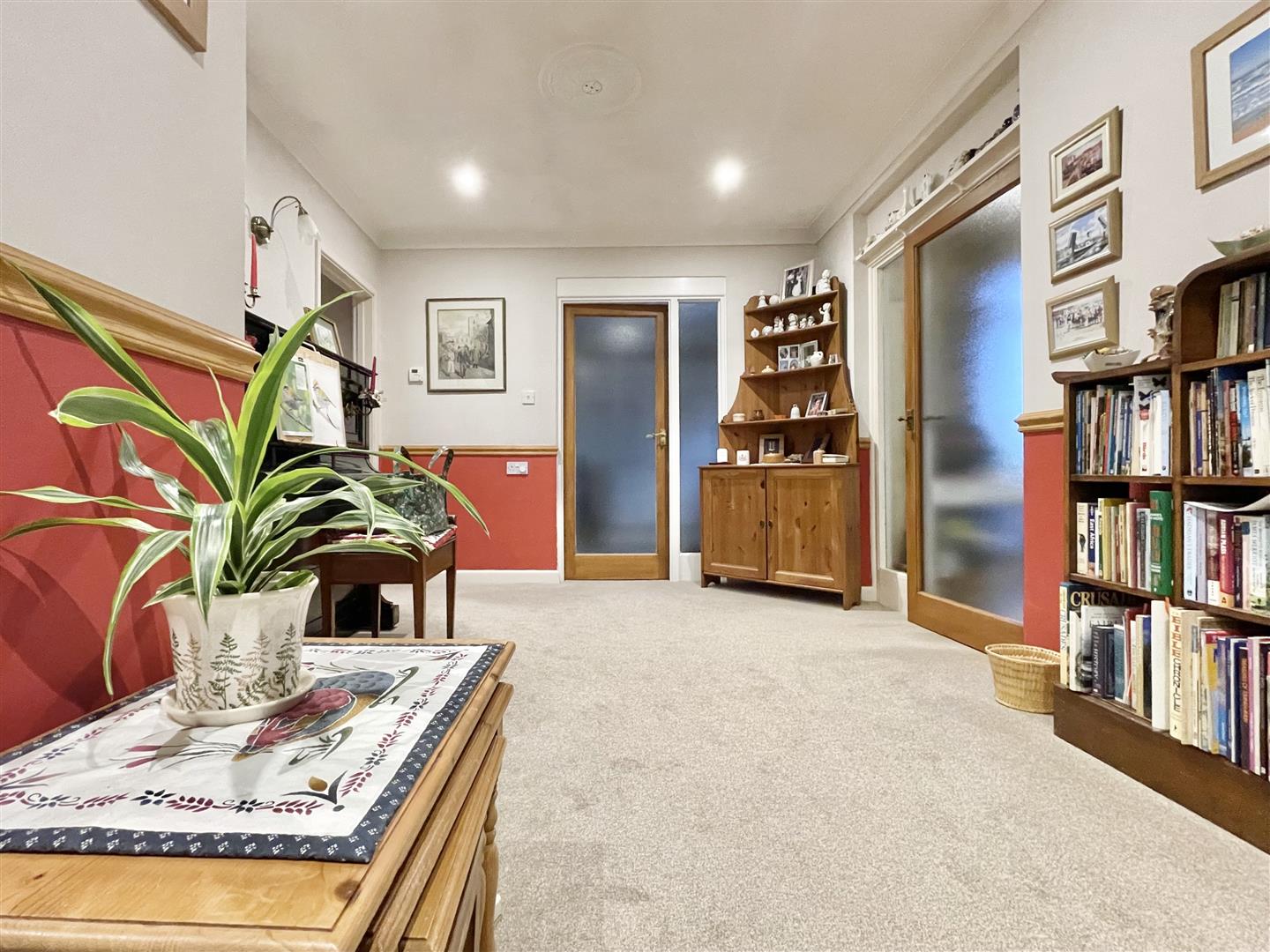 A versatile open plan space backing onto the living room, an excellent study or dining room, with glass doors leading into the study and the entrance hallway, ceiling coving finishes the room alongside ceiling spotlights. The room flows seamlessly into the living room.