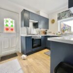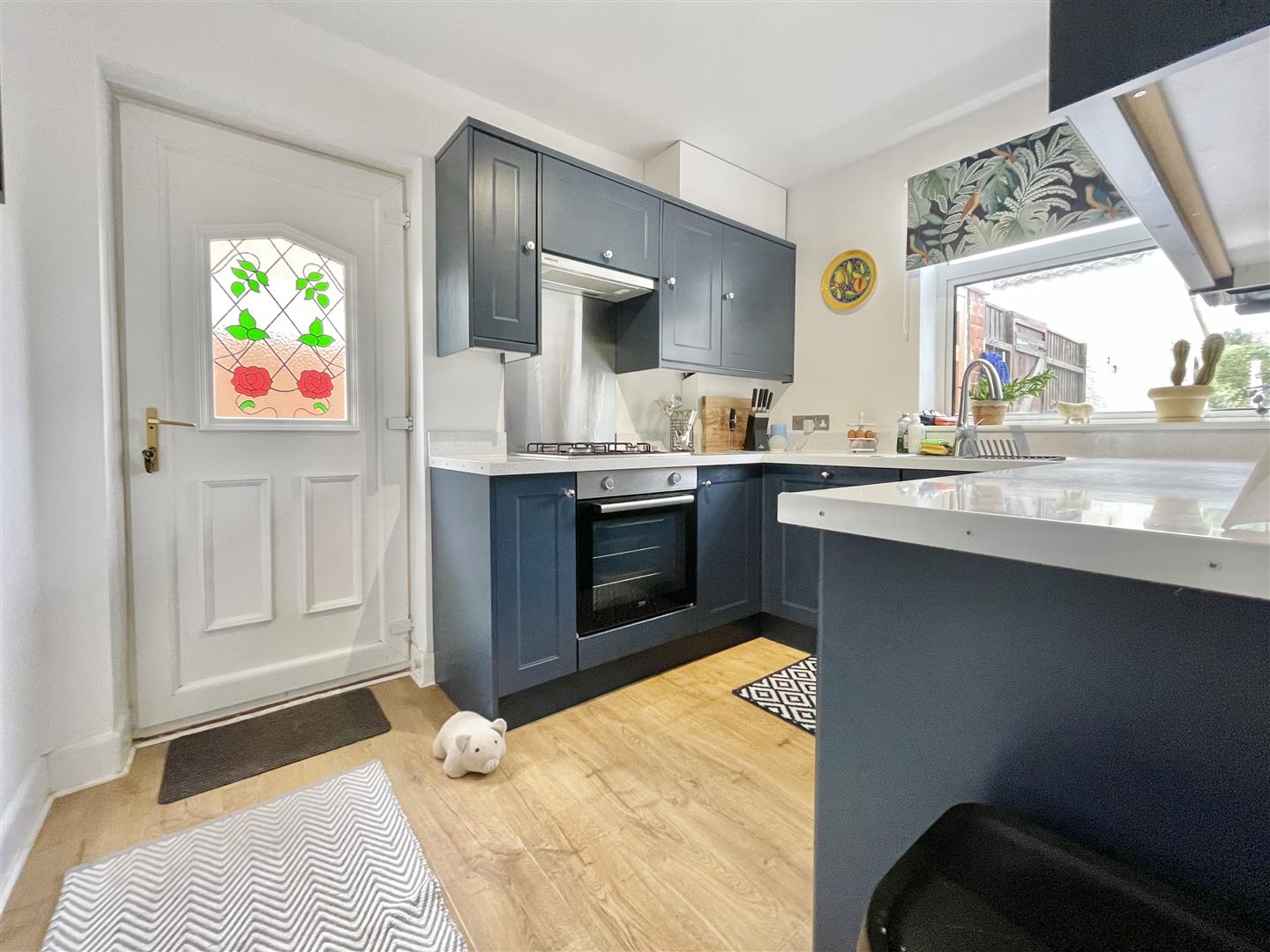 Rear-aspect kitchen with uPVC double-glazed door opening onto the side garden. Recently fitted with a modern range of base and wall units, featuring a four-ring gas hob with Samsung extractor over and an electric fan-assisted oven beneath. Integrated under-counter fridge and dishwasher. Single bowl stainless steel sink positioned beneath the window. Wood-effect laminate flooring continues into the next room.