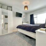 Rear-aspect double bedroom with a large uPVC double-glazed window overlooking the garden. Features a full wall-length built-in wardrobe with hanging space and shelving, wall-mounted radiator, and power points.