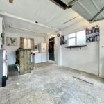 The garage is a large and versatile space with an up-and-over door, power, lighting, and plumbing suitable for utility appliances. A side-aspect obscured window and a rear-aspect window overlook the garden, while boarded storage in the pitched roof offers additional practical space.