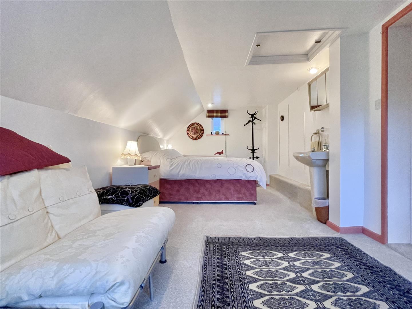 Double aspect room, wash hand basin, radiator, access to partially boarded loft with light.